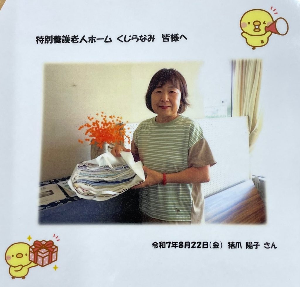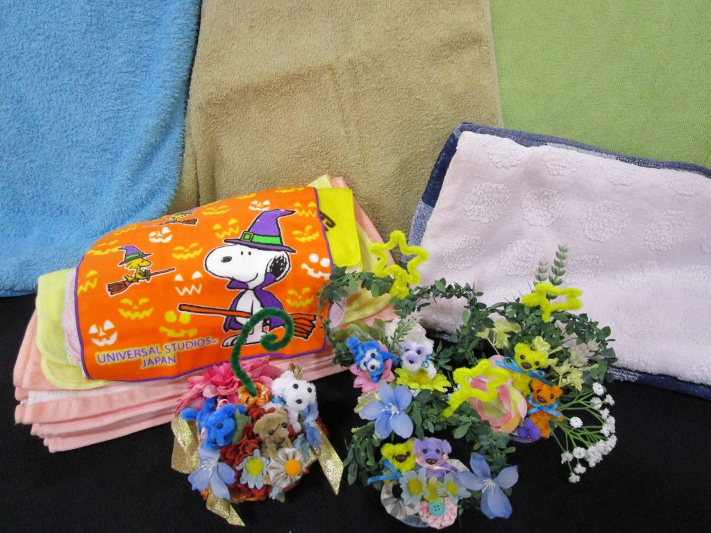 柏崎市社会福祉協議会様のサマーチャレンジボランテイアを通じて、市内の猪爪様他3名のかたから、タオルやかわいい飾り物を寄付していただきました。