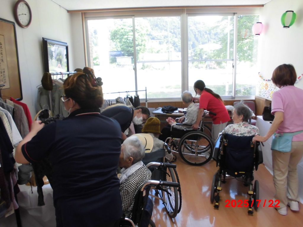バザー会場では、各利用者様が衣類や飾り物といったものの中から、好みの品やお目当ての品を探しながら、「これだ!」という品を施設内通貨で買い求めていました。